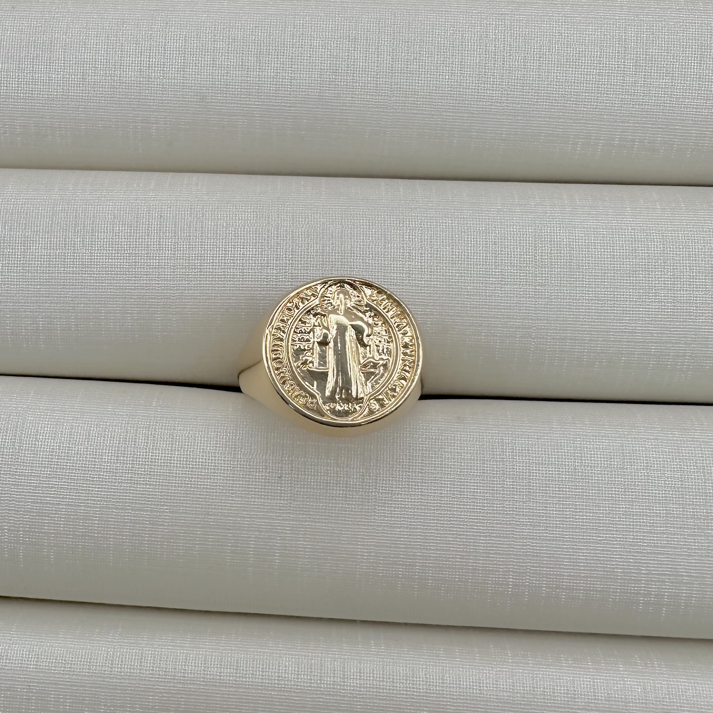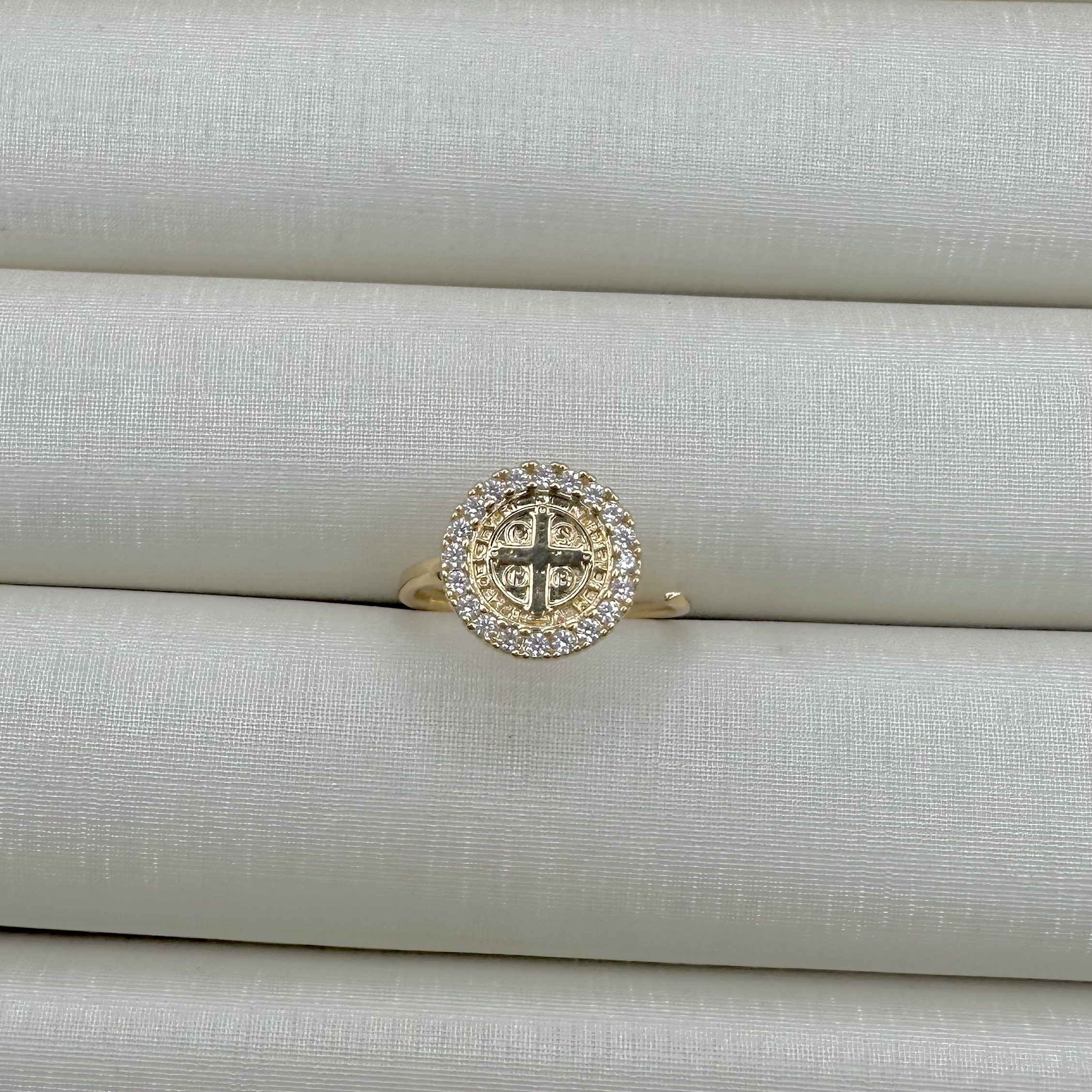 - Anel Ajustável Medalha de São Bento Lateral Cravejada