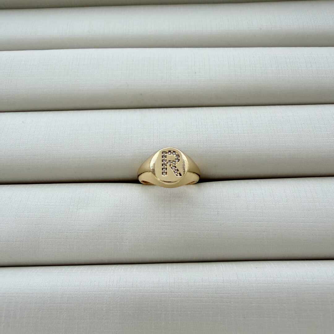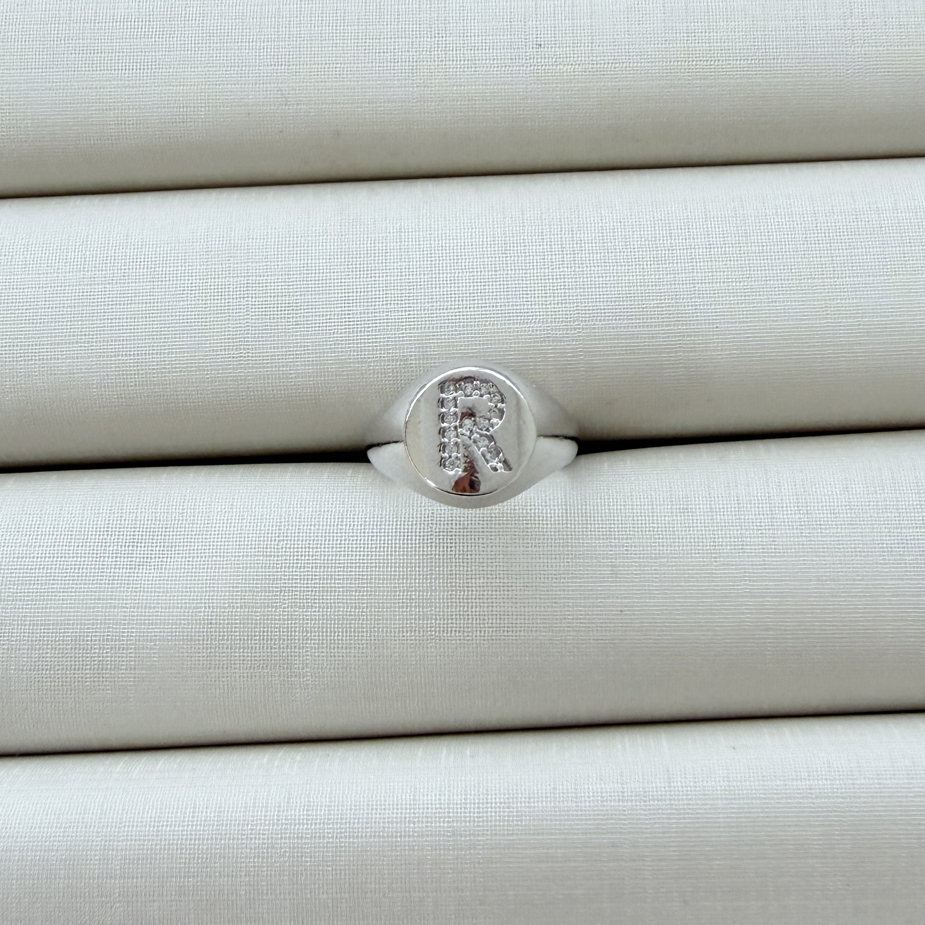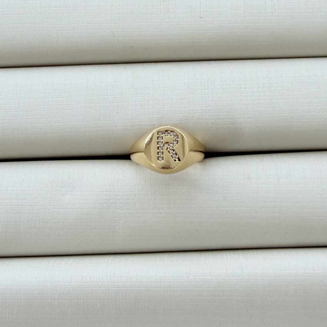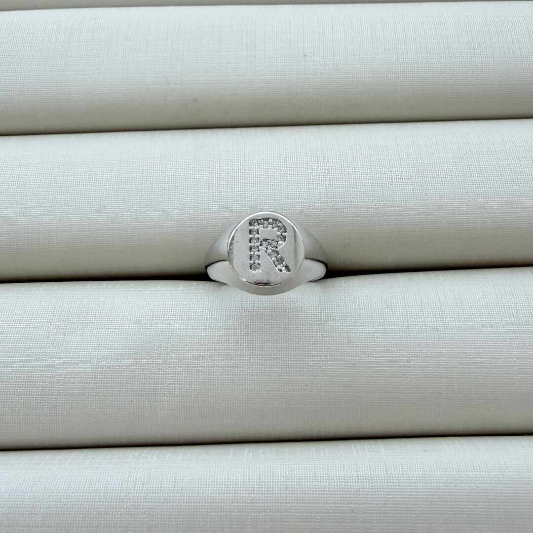 - Anel de Dedinho Ajustável com Inicial R Cravejada